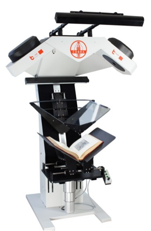 書本托架: v型電動化布局工作臺可以處理帶脊高達25 cm和處理重達30kg的書本,全自動電動V型光學(xué)級高精度玻璃壓稿臺。